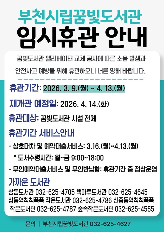 °ü·Ã ¾È³» »çÇ×Àº ºÎõ½Ã¸³µµ¼°ü ȨÆäÀÌÁö(www.bcl.go.kr¤ý¹Ù·Î °¡±â Ŭ¸¯)¿¡¼ È®ÀÎÇÒ ¼ö ÀÖÀ¸¸ç, °ü·Ã ¹®ÀÇ´Â ²Þºûµµ¼°ü(¢Ï032-625-4627)À¸·Î ÇÏ¸é µÈ´Ù.