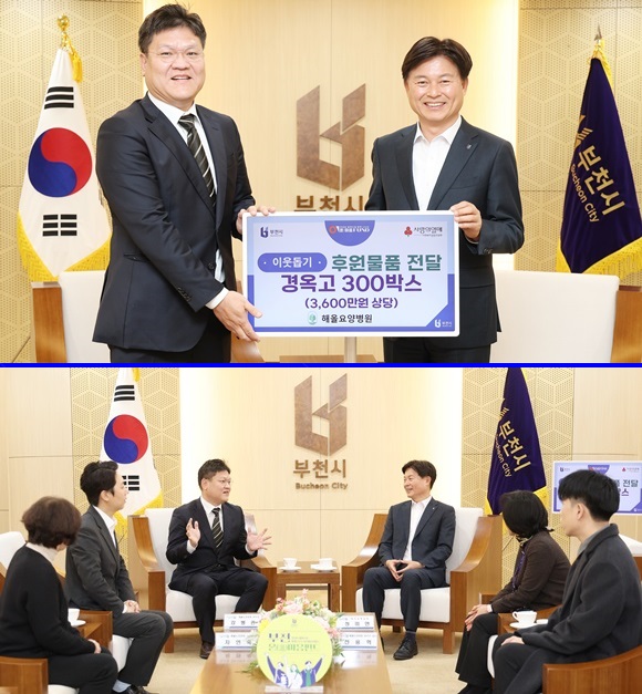 Á¶¿ëÀÍ ºÎõ½ÃÀå(¿À¸¥ÂÊ)ÀÌ 1ÀÏ ½Ãû 5Ãþ ¸¸³²½Ç¿¡»ç ±èµµÈ¯ ÇØ¿Ã¿ä¾çº´¿øÀåÀ¸·ÎºÎÅÍ 3õ600¸¸¿ø »ó´çÀÇ °æ¿Á°í 300¹Ú½º¸¦ ±âŹ¹Þ°í ±â³äÃÔ¿µÀ» Çϰí ÀÖ´Ù. ¾Æ·¡´Â Àü´Þ½Ä ÈÄ ´ã¼Ò¸¦ ³ª´©´Â ¸ð½À.(»çÁø= ºÎõ½Ã Á¦°ø)