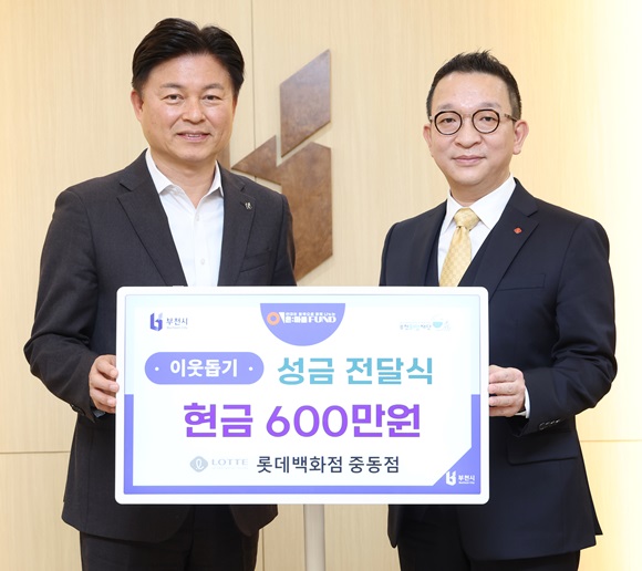 Á¶¿ëÀÍ ºÎõ½ÃÀå(¿ÞÂÊ)ÀÌ Çã¿õ ·Ôµ¥¹éÈ­Á¡ Áßµ¿Á¡ÀåÀ¸·ÎºÎÅÍ ÀÌ¿ôµ½±â ¼º±Ý 600¸¸¾ðÀ» ±âŹ¹Þ°í ±â³äÃÔ¿µÀ» Çϰí ÀÖ´Ù.(»çÁø= ºÎõ½Ã Á¦°ø)