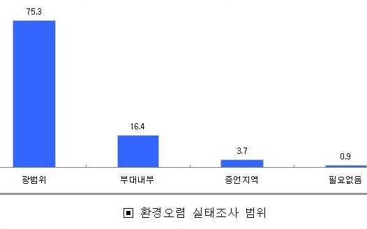 Àüü ÀÀ´äÀÚ¸¦ ´ë»óÀ¸·Î ¹Î¤ý°ü¤ý±º °øµ¿Á¶»ç´ÜÀÌ ½Ç½ÃÇϴ ȯ°æ¿À¿° Á¶»çÁö¿ª°ú ´ë»ó¿¡ °üÇØ ¹°Àº °á°ú, ÁֹΠ75.3%°¡ ¡°ºÎ´ë ÀüÁö¿ª°ú ÁÖº¯Áö¿ªÀÇ Åä¾ç¤ý¼ö¸Æ µî ±¤¹üÀ§ÇÑ Á¶»ç°¡ ÇÊ¿äÇÏ´Ù¡±°í ÀÀ´äÇß°í, 16.4%´Â ¡°±ººÎ´ë ³»ºÎ±¸¿ª¿¡ ´ëÇÑ Åä¾ç¤ý¼öÁúÁ¶»ç°¡ ÇÊ¿äÇÏ´Ù¡±°í ÀÀ´äÇß°í, 3.7%´Â ¡®¡®Áõ¾ðÀÌ ÀÖ¾ú´ø Áö¿ª¸¸ Á¶»ç°¡ ÇÊ¿äÇÏ´Ù¡°°í ÀÀ´äÇß´Ù.