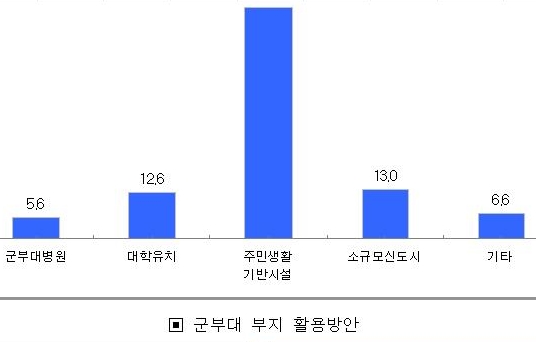 Àüü ÀÀ´äÀÚ¸¦ ´ë»óÀ¸·Î ±ººÎ´ë ÀÌÀüÀ» °¡Á¤ÇÏ°í ºÎÁö Ȱ¿ë ¹æ¾ÈÀ» ¹°Àº °á°ú, 62.2%ÀÇ ÁÖ¹ÎÀÌ ¡°µµ·Î¤ý°ø¿ø¤ýÁ¾ÇÕº´¿ø µî ÁֹΠÆíÀÇ ±â¹Ý½Ã¼³ÀÌ ÇÊ¿äÇÏ´Ù¡±°í ÀÀ´äÇßÀ¸¸ç, ±×µ¿¾È Á¤Ä¡±Ç µî¿¡¼ ³íÀǵƴø Ȱ¿ë ¹æ¾ÈÀÎ ¡®±ººÎ´ë Á¾ÇÕº´¿ø¡¯(5.6%), ¡®´ëÇÐ À¯Ä¡¡¯(12.6%), ¡®¼Ò±Ô¸ð ½Åµµ½Ã À¯Ä¡¡¯(13.0%) µîÀÇ ÀÀ´äÀº »ó´ëÀûÀ¸·Î ³·¾Ò´Ù. |