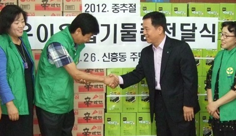 ºÎõ½Ã ¿ÀÁ¤±¸ ½ÅÈﵿ»õ¸¶À»ÇùÀÇȸ ±èÂù´ö ȸÀå(ºÎ±æÃà»ê À½½ÄÁ¡ ´ëÇ¥)ÀÌ Áö³ 26ÀÏ Ãß¼®À» ¸Â¾Æ ¾î·Á¿î ÀÌ¿ôµé¿¡°Ô Àü´ÞÇØ ´Þ¶ó¸ç ±è 100¹Ú½º¿Í ¶ó¸é 100¹Ú½º(350¸¸¿ø »ó´ç)¸¦ ½ÅÈﵿ Áֹμ¾Å͸¦ ±âŹÇß´Ù.