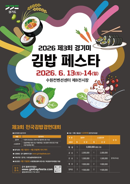 Âü°¡ ½Åû ¹× ÀÚ¼¼ÇÑ »çÇ×Àº ¡®2026 Á¦3ȸ °æ±â¹Ì ±è¹ä Æä½ºÅ¸¡¯ °ø½Ä ´©¸®Áý(www.gimbapfesta.com¤ý¹Ù·Î °¡±â Ŭ¸¯)¿¡¼­ È®ÀÎÇÒ ¼ö ÀÖ´Ù.