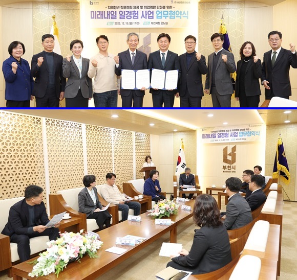 Á¶¿ëÀÍ ºÎõ½ÃÀå°ú ÀÓ¸í¼· ¢ßÈÞ¸ÕÀâÆ®·¯½ºÆ® ´ëÇ¥, ºÎõ½Ã ÃâÀÚ¡¤Ã⿬±â°üÀå µî °ü°èÀÚµéÀÌ 15ÀÏ ½Ãû 5Ãþ ¸¸³²½Ç¿¡¼­ ¡®¹Ì·¡ ³»ÀÏ ÀϰæÇè »ç¾÷¡¯ ¾÷¹« Çù¾àÀ» ü°áÇÏ°í ±â³äÃÔ¿µÀ» Çϰí ÀÖ´Ù. ¾Æ·¡´Â Çù¾à½Ä ÈÄ ´ã¼Ò¸¦ ³ª´©´Â ¸ð½À.(»çÁø= ºÎõ½Ã Á¦°ø)