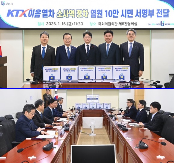 Á¶¿ëÀÍ ºÎõ½ÃÀå°ú Áö¿ª±¸ ±¹È¸ÀÇ¿ø 3¸í 16ÀÏ ±¹È¸ÀÇ¿øÈ¸°ü Á¦6°£´ãȸ½Ç¿¡¼­ ÃÑ 12¸¸ 5õ842¸íÀÇ ¼­¸íÀÌ ´ã±ä KTX-ÀÌÀ½¿­Â÷ ¼Ò»ç¿ª Á¤Â÷¸¦ Ã˱¸ÇÏ´Â ¼­¸íºÎ¸¦ ±¹Åä±³ÅëºÎ¿¡ Àü´ÞÇß´Ù. ¿ÞÂʺÎÅÍ ¼­¿µ¼®(ºÎõ½Ã°©)¡¤À̰ÇÅÂ(ºÎõ½Ãº´) ±¹È¸ÀÇ¿ø, È«Áö¼± ±¹Åä±³ÅëºÎ Á¦2Â÷°ü, Á¶¿ëÀÍ ºÎõ½ÃÀå, ±è±âÇ¥(ºÎõ½ÃÀ») ±¹È¸ÀÇ¿ø. (»çÁø= ºÎõ½Ã Á¦°ø)