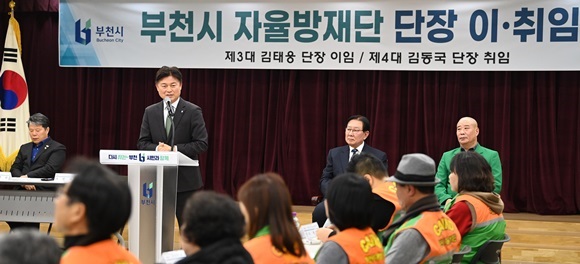Á¶¿ëÀÍ ºÎõ½ÃÀåÀÌ ¡®ºÎõ½Ã ÀÚÀ²¹æÀç´ÜÀå ÀÌ¡¤ÃëÀӽġ¯¿¡¼­ Ãà»ç¸¦ Çϰí ÀÖ´Ù.(»çÁø= ºÎõ½Ã Á¦°ø)