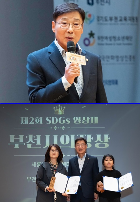 ±èº´Àü ºÎõ½ÃÀÇȸ ÀÇÀåÀÌ ÀÚ³­ 23ÀÏ ¿­¸° ¡®Á¦2ȸ ºÎõ½Ã SDGs(Áö¼Ó°¡´É¹ßÀü¸ñÇ¥) ¿µ»óÁ¦¡¯¿¡¼­ Ãà»ç¸¦ Çϰí, ºÎõ½ÃÀÇȸ ÀÇÀå»ó ¼ö»óÀÚ¸¦ ½Ã»óÇÏ°í ±â³äÃÔ¿µÀ» Çϰí ÀÖ´Ù.(»çÁø= ºÎõ½ÃÀÇȸ Á¦°ø)