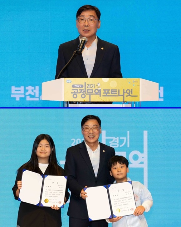 ±èº´Àü ºÎõ½ÃÀÇȸ ÀÇÀåÀÌ Áö³­ 24ÀÏ ¿­¸° ¡®2025 °øÁ¤¹«¿ª Æ÷Æ®³ªÀÕ¡¯ °³¸·½Ä¿¡¼­ Ãà»ç¸¦ Çϰí ÀÖ´Ù. ¾Æ·¡´Â °øÁ¤¹«¿ª °ø¸ðÀü ¡®ÆòÈ­»ó¡¯ ¼ö»óÀÚ 2¸í¿¡°Ô »óÀåÀ» ¼ö¿©ÇÏ°í ±â³äÃÔ¿µÀ» ÇÏ´Â ¸ð½À.(»çÁø= ºÎõ½ÃÀÇȸ Á¦°ø)