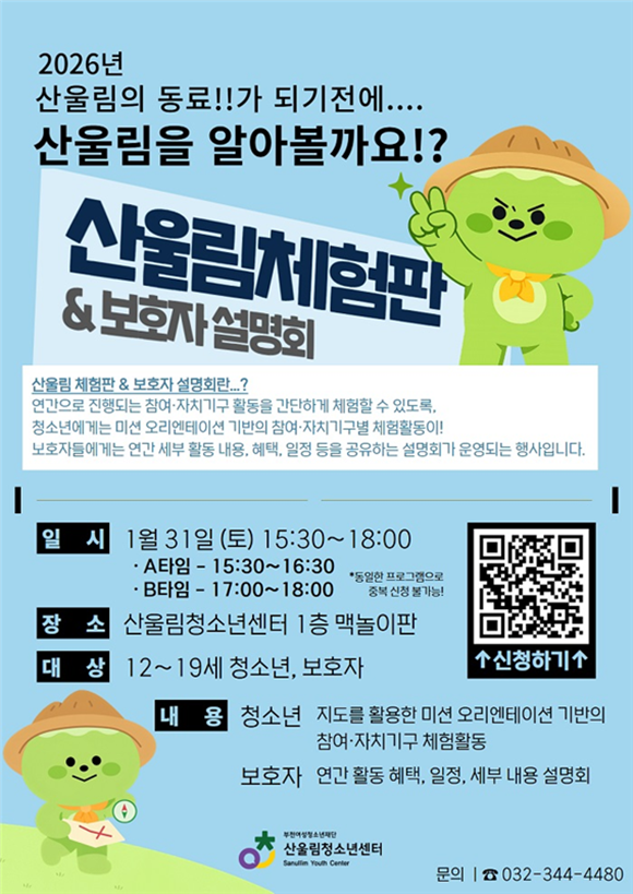 ºÎõ¿©¼ºÃ»¼Ò³âÀç´Ü(´ëÇ¥ÀÌ»ç À̰­ÀÎ)ÀÌ ¿î¿µÇÏ´Â »ê¿ï¸²Ã»¼Ò³â¼¾ÅÍ(¼¾ÅÍÀå ¾ç½ÂºÎ)´Â ¿À´Â 1¿ù 31ÀÏ 2026³âµµ Âü¿©¡¤ÀÚÄ¡±â±¸ Ȱµ¿¿¡ °ü½É Àִ û¼Ò³â°ú º¸È£ÀÚ¸¦ ´ë»óÀ¸·Î ¡®»ê¿ï¸² üÇèÆÇ & º¸È£ÀÚ ¼³¸íȸ¡¯¸¦ °³ÃÖÇÑ´Ù.