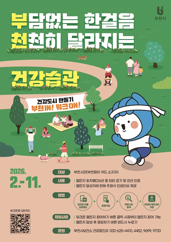 ¡®ºÎõIN! ¿öÅ©ON!¡¯ °È±â 縰Áö °ü·Ã ¹®ÀÇ´Â ºÎõ½Ãº¸°Ç¼Ò °Ç°ÁõÁø°ú °Ç°µµ½ÃÆÀ(¢Ï032-625-4410, 032-625-4452, 032-625-9699, 032-625-9733)À¸·Î ÇÏ¸é µÈ´Ù.