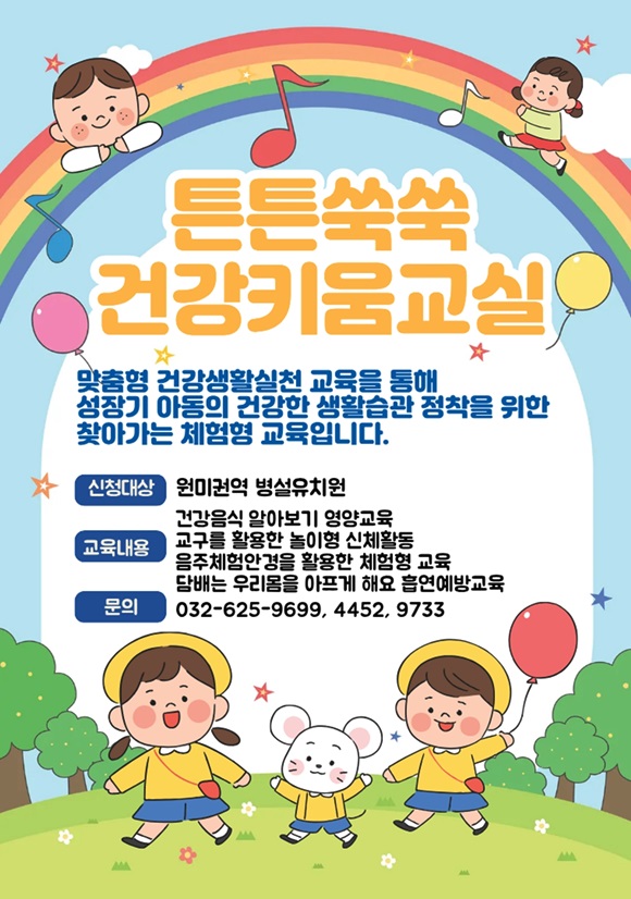 ¼ÛÁ¤¿ø ºÎõ½Ãº¸°Ç¼ÒÀåÀº ¡°Æò»ý °Ç°­ÀÇ ±âƲÀÌ Çü¼ºµÇ´Â Áß¿äÇÑ ½Ã±âÀÎ ¹ÌÃëÇÐ ¾Æµ¿µé¿¡°Ô üÇè Áß½ÉÀÇ ±³À° ÇÁ·Î±×·¥À» ÅëÇØ ÀÚ¿¬½º·´°Ô °Ç°­ÇÑ ½À°üÀ» ÀÍÈú ¼ö ÀÖµµ·Ï Çϰڴ١±¸ç ¡°°Ç°­ÇÏ°Ô ¼ºÀåÇÒ ¼ö Àִ ȯ°æ Á¶¼º¿¡µµ Àû±Ø Èû¾²°Ú´Ù¡±°í ¸»Çß´Ù.