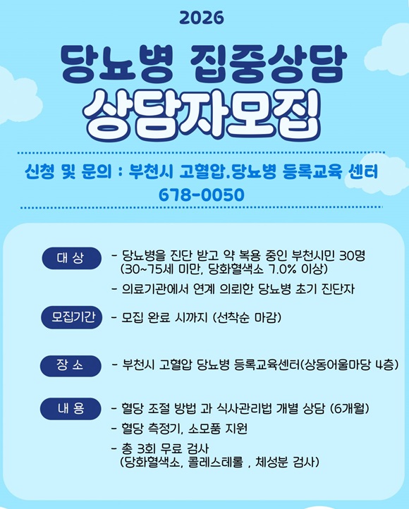 °ü·Ã ¹®ÀÇ´Â ºÎõ½Ã °íÇ÷¾Ð¡¤´ç´¢º´ µî·Ï±³À°¼¾ÅÍ(¢Ï032-678-0050)³ª ȨÆäÀÌÁö(¤ý¹Ù·Î °¡±â Ŭ¸¯)¿¡¼­ °¡´ÉÇÏ´Ù.