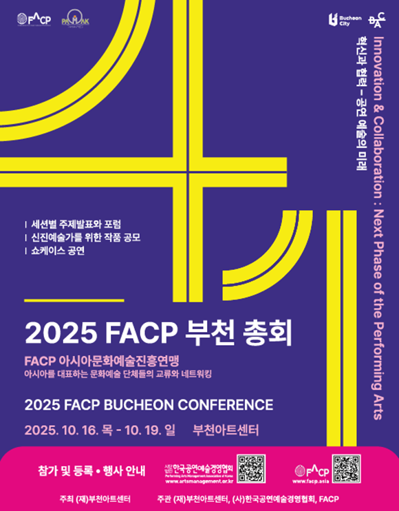 (Àç)ºÎõ¾ÆÆ®¼¾ÅÍ(´ëÇ¥ÀÌ»ç Á÷¹«´ëÇà À¯¼ºÁØ)°¡ ÁÖÃÖÇϰí, (Àç)ºÎõ¾ÆÆ®¼¾ÅÍ¡¤¾Æ½Ã¾Æ¹®È­ÁøÈ↓¸Í(FACP¡¤Federation for Asian Cultural Promotion)¡¤(»ç)Çѱ¹°ø¿¬¿¹¼ú°æ¿µÇùȸ°¡ °øµ¿ ÁÖ°üÇÏ´Â ¡®Á¦41ȸ 2025 FACP ºÎõ ÃÑȸ¡¯°¡ 10¿ù 16ÀϺÎÅÍ 19ÀϱîÁö ³ªÈê°£ ºÎõ¾ÆÆ®¼¾ÅÍ ÀÏ´ë¿¡¼­ °³ÃֵȴÙ.