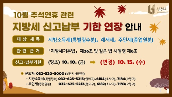 ºÎõ½Ã´Â ±ä Ãß¼® ¿¬ÈÞ(10¿ù 3~9ÀÏ)·Î ÀÎÇØ ½Ã¹ÎµéÀÌ Áö¹æ¼¼¸¦ ±âÇÑ ³»¿¡ ½Å°í¡¤³³ºÎÇÏ´Â µ¥ ºÒÆíÀ» °ÞÀ» °ÍÀ¸·Î ¿¹»óµÊ¿¡ µû¶ó 10¿ù ³³ºÎ ´ë»óÀÎ Áö¹æ¼¼ 3Á¾ÀÇ ½Å°í¡¤³³ºÎ ±âÇÑÀ» ±âÁ¸ 10¿ù 10ÀÏ¿¡¼­ 10¿ù 15ÀϽÎÁö·Î ¿¬ÀåÇÑ´Ù°í 24ÀÏ ¹àÇû´Ù.