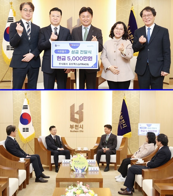 »çÁø À§ ¿ÞÂʺÎÅÍ ±Ç¼¼±¤ ºÎõÈñ¸ÁÀç´Ü ÀÌ»çÀå, À±Á¾Ã¶ ¢ßÀ¯Æ®·¢½º´ëÇ¥ÀÌ»ç, Á¶¿ëÀÍ ºÎõ½ÃÀå, Á¤¾Ö°æ ºÎõ½Ã º¹Áö±¹Àå, ±è¹ü¿ë ºÎõÈñ¸ÁÁ¦´Ü »óÀÓÀ̻簡 Áö³­ 21ÀÏ ¢ßÀ¯Æ®·¢½ºÀÇ ÀÌ¿ôµ½±â ¼º±Ý 5õ¸¸¿ø Àü´Þ½Ä¿¡¼­ ±â³äÃÔ¿µÀ» Çϰí ÀÖ´Ù. ¾Æ·¡´Â ´ã¼Ò¸¦ ³ª´©´Â ¸ð½À.(»çÁø= ºÎõ½Ã Á¦°ø)