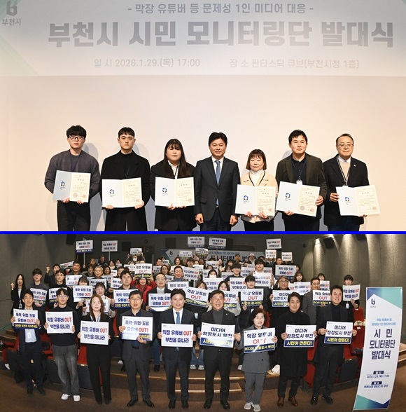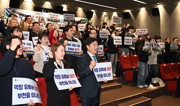¡®¸·Àå À¯Æ©ºê µî ¹®Á¦¼º 1ÀÎ ¹Ìµð¾î ´ëÀÀ ½Ã¹Î ¸ð´ÏÅ͸µ´Ü¡¯ ¹ß´ë½Ä¿¡¼ Á¶¿ëÀÍ ºÎõ½ÃÀå, ±èº´Àü ºÎõ½ÃÀÇȸ ÀÇÀåÀ» ºñ·ÔÇÑ ½Ã¹Î ¸ð´ÏÅ͸µ´Ü µî Âü¼®ÀÚµéÀÌ ¡®¸·Àå À¯Æ©¹ö ±ÙÀý¡¯À» À§ÇÑ ¸Þ½ÃÁö Ä«µå¸¦ µé°í ±¸È£¸¦ ¿ÜÄ¡°í ÀÖ´Ù.(»çÁø= ºÎõ½Ã Á¦°ø)
