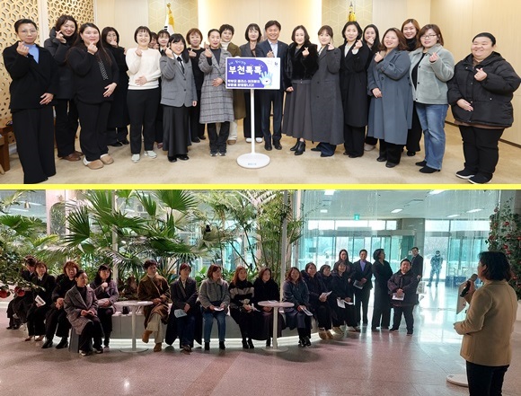 Á¶¿ëÀÍ ºÎõ½ÃÀåÀÌ Áö³Í 12ÀÏ ½Ãû 5Ãþ ¸¸³²½Ç¿¡¼­ Çкθð Æú¸®½º ȸ¿øµé°ú ±â³äÃÔ¿µÀ» Çϰí ÀÖ´Ù. ÀÌ·¡´Â ºÎõ½Ãû 1Ãþ »ê¼ÒÁ¤¿ø¿¡ ´ëÇÑ ¼³¸íÀ» µè´Â ¸ð½À.(»çÁø= ºÎõ½Ã Á¦°ø)