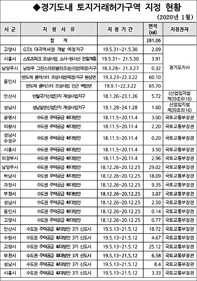 ÇÑÆí, À̹ø ÇØÁ¦ Á¶Ä¡·Î µµ³» ÅäÁö°¡°Ý ¾ÈÁ¤È¸¦ À§ÇØ ÁöÁ¤¤ý °ü¸®µÇ°í ÀÖ´Â ÅäÁö°Å·¡Çã°¡±¸¿ª ¸éÀûÀº ÃÑ 13°³ ½Ã(ã¼) 25°³ Áö±¸ 281.06§´·Î, °æ±âµµ Àüü ¸éÀû(10,193§´)ÀÇ 2.76%ÀÌ´Ù. ¡å¾Æ·¡ Ç¥ ÂüÁ¶