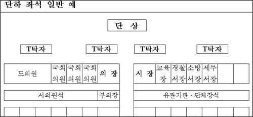 ¡ãÁ¼® ¹èÄ¡ ±âÁØÀº ½Ã(ã¼) ´ÜÀ§ ´ë±Ô¸ð Çà»çÀÇ °æ¿ì ½ÃÀå, ½ÃÀÇȸ ÀÇÀå, ±¹È¸ÀÇ¿øÀº Çà»ç ´Ü»ó Áß¾Ó¿¡ À§Ä¡Çϰí, µµÀÇ¿ø, ½ÃÀÇȸ ºÎÀÇÀå, ½ÃÀÇȸ »óÀÓÀ§¿øÀåÀº Çà»ç±Ô¸ð¿¡ ¸Â°Ô 2~3¿¿¡ À§Ä¡Çϸç, ½ÃÀÇ¿øÀº »óÀÓÀ§¿øÀå ¹Ù·Î µÞ¿¿¡ À§Ä¡ ¶Ç´Â º°µµ Á¼®À» ¸¶·ÃÅä·Ï Çß´Ù.