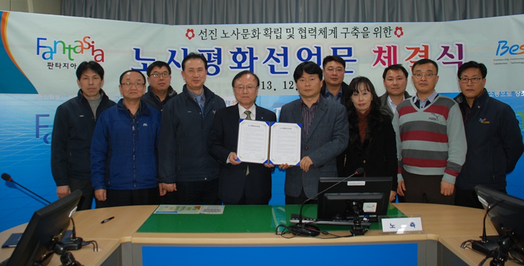 °ø´Ü ³ë»ç´Â ¡®³ë»ç Æòȼ±¾ð¹®¡¯ ü°áÀ» ÅëÇØ Çù·ÂÀÇ ¸ð¹üÀû ³ë»ç°ü°è ±¸ÃàÀ» ÅëÇÑ ´ë½Ã¹Î ¼ºñ½º °È¸¦ À§ÇØ ³ë»ç°¡ ½Å·Ú¿Í Á¸Áß, Âü¿©¿Í Çù·Â, ÀÚÀ²°ú Ã¥ÀÓÀÇ ½Å(ãæ)³ë»ç¹®È¸¦ ±¸ÃàÇϰí, °ø´ÜÀÇ °æ¿µÇõ½Å ¿îµ¿¿¡ Àû±Ø µ¿ÂüÇϰí, ½Ã¹Îº¹¸® ÁõÁø°ú Áö¿ª»çȸ ¹ßÀü¿¡ ±â¿©ÇØ ºÎõ½Ã¹ÎÀÇ »ç¶û°ú ½Å·Ú¸¦ ¹Þ´Â Ŭ¸° °ø±â¾÷À¸·Î °Åµì³ª±â À§ÇØ Àû±Ø Çù·ÂÇϱâ·Î Çß¿´´Ù.