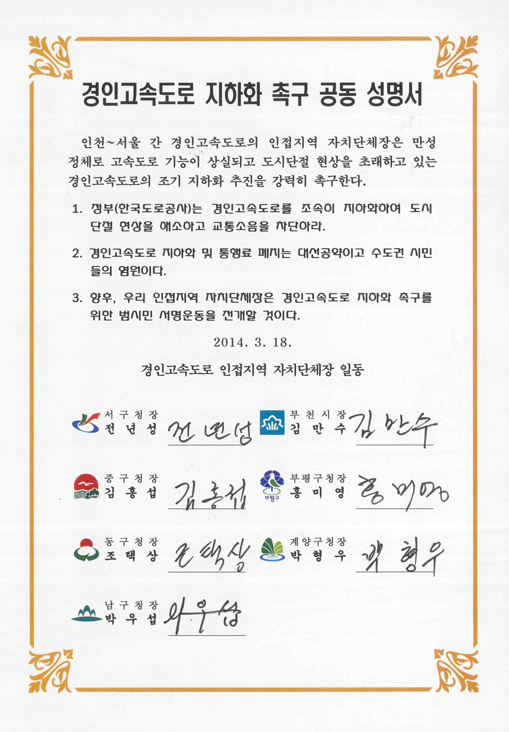 ºÎõ½Ã°¡ ¼¿ï ±¸·Î±¸, ÀÎõ ºÎÆò±¸¡¤³²µ¿±¸¡¤³²±¸¿Í ¡®°æÀÎÀüö(°æÀμ±) ÁöÇÏÈ¡¯¸¦ °øµ¿ ÃßÁøÇÏÁö´Â ÇѸñ¼Ò¸®¸¦ ³»¸é¼ Áß¾ÓÁ¤ºÎ Á¤Ã¥°úÁ¦·Î ¼±Á¤ÇÒ °ÍÀ» Ã˱¸Çϱâ À§ÇØ 3¿ù¸»±îÁö 5°³ ÁöÀÚü °øµ¿À¸·Î ¡®100¸¸ ½Ã¹Î ¼¸í¿îµ¿¡¯À» Àü°³Çϰí ÀÖ´Â °¡¿îµ¥(¢¹°ü·Ã±â»ç Ŭ¸¯), À̹ø¿¡´Â ÀÎõ ¼±¸¡¤Áß±¸¡¤µ¿±¸¡¤ºÎÆò±¸¡¤°è¾ç±¸ µî°ú ÇÔ²² ¡®°æÀΰí¼Óµµ·Î ÁöÇÏÈ¡¯¸¦ Á¤ºÎ¿¡ °øµ¿ Ã˱¸Å°·Î ÇÏ°í ¹ü½Ã¹Î ¼¸í¿îµ¿À» Àü°³Çϱâ·Î Çß´Ù.