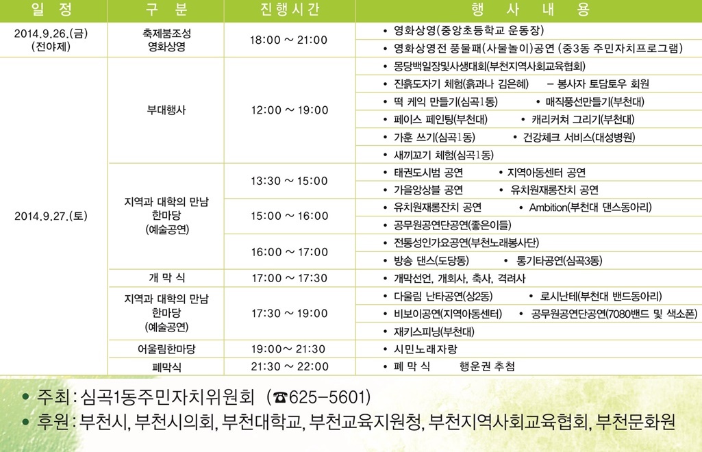 ¶Ç ¿ÀÈÄ 1½Ã30ºÐºÎÅÍ 3½Ã±îÁö´Â űǵµ ½Ã¹ü °ø¿¬, Áö¿ª¾Æµ¿¼¾ÅÍ °ø¿¬, °¡À» ¾Ó»óºí °ø¿¬, À¯Ä¡¿ø Àç·ÕÀÜÄ¡ °ø¿¬ µîÀÌ ¿­¸®°í, ¿ÀÈÄ 3½ÃºÎÅÍ 5½Ã±îÁö´Â À¯Ä¡¿ø Àç·ÕÀÜÄ¡ °ø¿¬, ºÎõ´ë ´í½ºµ¿¾Æ¸® AmbitionÀÇ ´í½º °ø¿¬°ú °ø¹«¿ø °ø¿¬´Ü ÁÁÀºÀ̵éÀÇ ³ë·¡ °ø¿¬, ºÎõ³ë·¡ºÀ»ç´ÜÀÇ ÀüÅë ¼ºÀÎ °¡¿ä °ø¿¬, µµ´çµ¿ ´í½ºµ¿¾Æ¸®ÀÇ ¹æ¼Û ´í½º, ½É°î3µ¿ ±âŸµ¿¾Æ¸®ÀÇ Åë±âŸ °ø¿¬ µîÀÌ À̾îÁø´Ù.