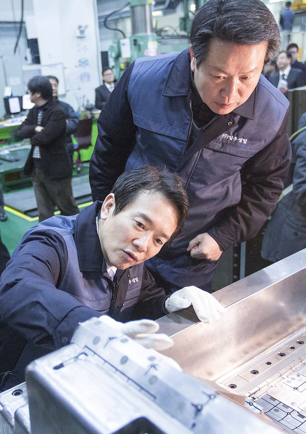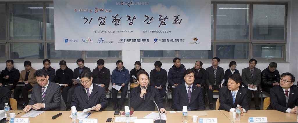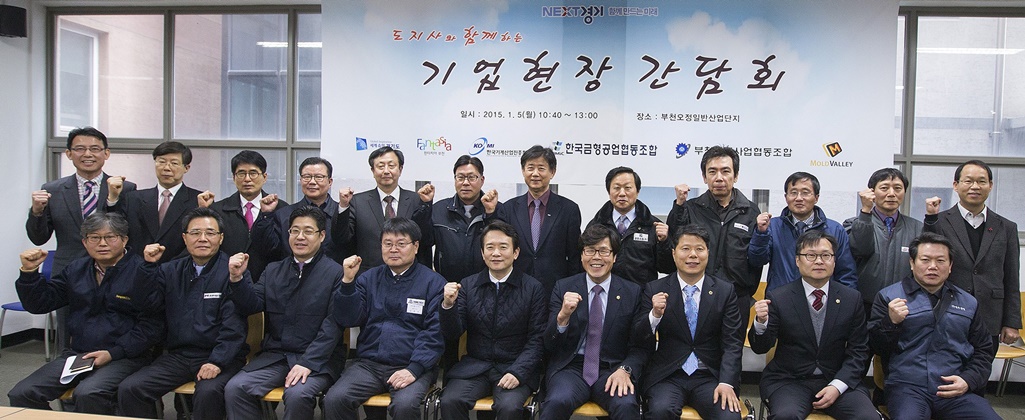 ³²°æÇÊ °æ±âÁö»ç(¿À¸¥ÂÊ)°¡ 5ÀÏ ¿ÀÀü ºÎõ½Ã ¿ÀÁ¤ÀϹݻê¾÷´ÜÁö¸¦ ÇöÀ广¹®ÇØ »ïÀÏÅ×Å©¢ß¿¡¼ ±â¾÷Àεé°ú °£´ãȸ¸¦ Çϰí ÀÖ´Ù. »çÁø ¿ÞÂÊÀº ¿Àº´±Ç ºÎõ½Ã ºÎ½ÃÀå. 2015.1.5 <<°æ±âµµ Á¦°ø>>