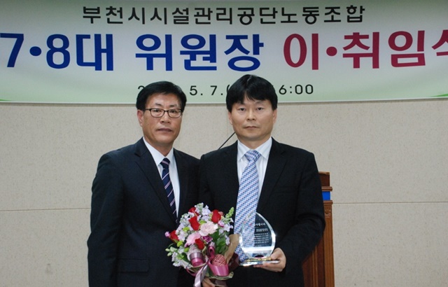 ¡âÁ¦8´ë ºÎõ½Ã ½Ã¼³°ü¸®°ø´Ü ³ëÁ¶À§¿øÀåÀ¸·Î ÃëÀÓÇÑ °­¸í°ü À§¿øÀå(¿ÞÂÊ)ÀÌ Á¦7´ë ±è¼ö¼ö À§¿øÀå(¿À¸¥ÂÊ)¿¡ °ø·ÎÆÐ¸¦ Àü´ÞÇß´Ù.