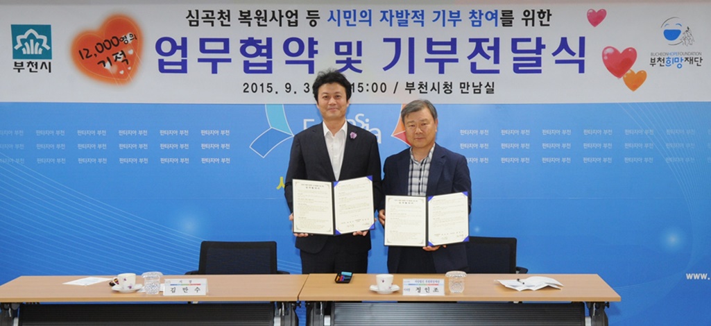 3ÀÏ ¿ÀÈÄ ºÎõ½Ãû ¸¸³²½Ç¿¡¼­ ¿­¸° ½É°îõ º¹¿ø»ç¾÷ µî ½Ã¹ÎÀÇ ÀÚ¹ßÀû ±âºÎ Âü¿©¸¦ À§ÇÑ ¾÷¹« Çù¾à ¹× ±âºÎ Àü´Þ½Ä¿¡¼­ ±è¸¸¼ö ºÎõ½ÃÀå(¿ÞÂÊ)°ú Á¤ÀÎÁ¶ ºÎõÈñ¸ÁÀç´Ü ÀÌ»çÀåÀÌ Çù¾àÀ» ü°áÇÏ°í ±â³äÃÔ¿µÀ» Çϰí ÀÖ´Ù.