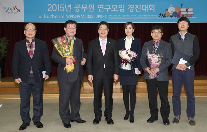Áö³­ 4ÀÏ ¿ÀÈÄ ºÎõ½Ãû ¼ÒÅ븶´ç¿¡¼­ ¿­¸° ¡®2015³â °ø¹«¿ø ¿¬±¸¸ðÀÓ °æÁø´ëȸ¡¯¿¡¼­ º»¼±¿¡ ÁøÃâÇÑ ¡®°ÇÃàÇа³·Ð¡¯, ¡®Çູ¸¶À» ¸¸µé±â¡¯, ¡®»ó»ó¹ßÀü¼Ò¡¯, ¡®¼ÛÇаñ »ç¶û¹æ¡¯, ¡®¿ÎÀÚÁö²¬¡¯ µî 5°³ ¿¬±¸¸ðÀÓ ´ëÇ¥µéÀÌ ½Ã»ó½ÄÀ» °®°í ¿Àº´±Ç ºÎ½ÃÀå(°¡¿îµ¥)°ú ±â³äÃÔ¿µÀ» Çϰí ÀÖ´Ù.