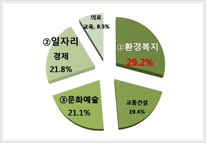 ½Ã¹ÎµéÀÌ °ü½ÉÀ» °®´Â ½ÃÁ¤ºÐ¾ß·Î´Â ¡®È¯°æº¹Áö¡¯°¡ 29.2%·Î °¡Àå ³ô°Ô ³ªÅ¸³µ°í, ±× ´ÙÀ½À¸·Î ¡®ÀÏÀÚ¸®¤ý°æÁ¦¡¯(21.8%), ¡®¹®È¿¹¼ú¡¯(21.1%), ¡®±³Å롯(19.4%), ¡®±³À°¤ýÀǷᡯ(8.5%) ¼øÀ¸·Î ³ªÅ¸³µ´Ù. ¿ø¹Ì¤ý¼Ò»ç±¸¿Í ´Þ¸® ¿ÀÁ¤±¸ ÁÖ¹ÎÀº ¡®ÀÏÀÚ¸®¤ý°æÁ¦¡¯ ºÐ¾ß¿¡ ´ëÇÑ °ü½ÉÀÌ ´õ ³ô¾Ò´Ù.