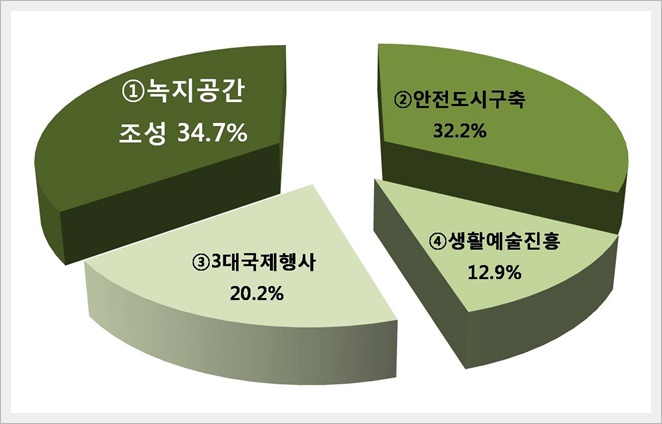 ¸¸Á·ÇÏ´Â »ç¾÷À¸·Î´Â ¡®³ìÁö°ø°£ Á¶¼º¡¯(34.7%), ¡®¾ÈÀüµµ½Ã¡¯(32.2%), ¡®3´ë ±¹Á¦Çà»ç¡¯(20.2%), ¡®»ýȰ¿¹¼ú ÁøÈ(12.9%) ¼øÀ¸·Î ÀÀ´äÇß´Ù.