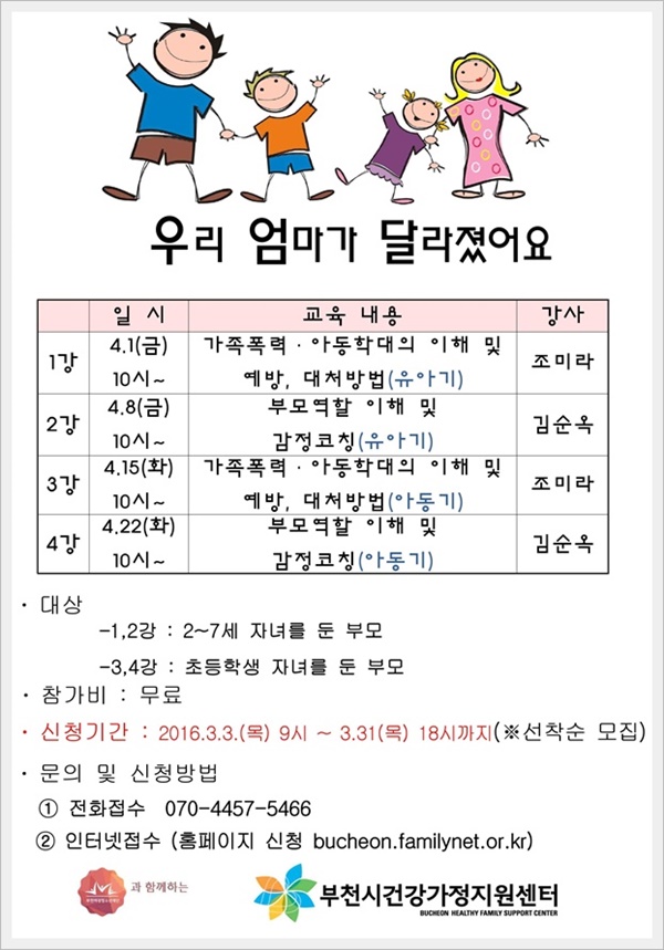 ºÎ¸ð±³À°¿¡ Âü°¡ÇÏ°í ½ÍÀº ½Ã¹ÎÀº ¿À´Â 31ÀϱîÁö ºÎõ½Ã °Ç°°¡Á¤Áö¿ø¼¾ÅÍ È¨ÆäÀÌÁö(bucheon.familynet.or.kr¤ý¹Ù·Î °¡±â Ŭ¸¯) ¶Ç´Â ÀüÈ(¢Ï070-4457-5466)·Î ½ÅûÇÏ¸é µÈ´Ù.