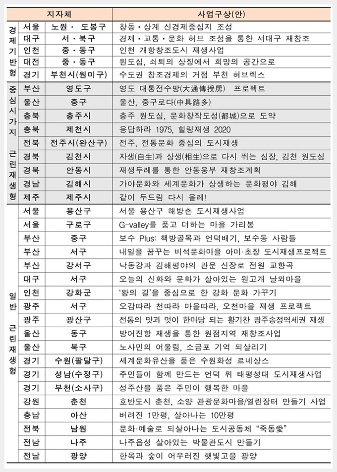 À̳¯ ȸÀÇ¿¡¼ Á¤ºÎ´Â ¿ì¼±, ±¹³» µµ½ÃÀÇ 3ºÐÀÇ 2¿¡¼ Àα¸ °¨¼Ò, »ê¾÷ ħü µî ¼èÅð°¡ ÁøÇàµÇ¸é¼ µµ½ÃÀç»ýÁ¤Ã¥ÀÇ Çʿ伺ÀÌ ³ô¾ÆÁü¿¡ µû¶ó Áö³ÇØ ÁöÀÚü °ø¸ð¸¦ °ÅÃÄ ¼±Á¤µÈ ÃÑ 33°÷(°æÁ¦±â¹ÝÇü 5°÷, Á߽ɽð¡Áö ±Ù¸°Àç»ýÇü 9°÷, ÀÏ¹Ý ±Ù¸°Àç»ýÇü 19°÷)ÀÇ Áö¿ªÀ» Áö¿øÇØ Àü±¹Àû µµ½Ã¼èÅð Çö»ó¿¡ ´ëÀÀÇϱâ·Î °áÁ¤Çß´Ù.