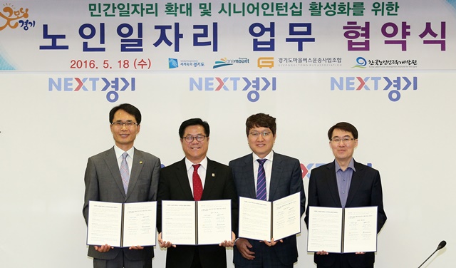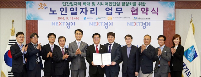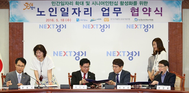 18ÀÏ ¿ÀÀü °æ±âµµÃ» »óȲ½Ç¿¡¼­ ¹Î°£ÀÏÀÚ¸® È®´ë¿Í ½Ã´Ï¾î ÀÎÅÏ½Ê È°¼ºÈ­¸¦ À§ÇÑ ³ëÀÏ ÀÏÀÚ¸® ¾÷¹« Çù¾à½Ä¿¡¼­ À̱â¿ì °æ±âµµ »çȸÅëÇÕºÎÁö»ç°¡ Âü¼®ÀÚµé°ú Çù¾à¼­¿¡ ¼­¸íÀ» Çϰí ÀÖ´Ù. 2016.5.18