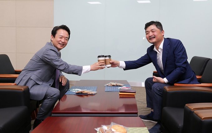 ³²°æÇÊ °æ±âµµÁö»ç¿Í ±è¹ü¼ö īī¿ÀÀÇÀåÀÌ 26ÀÏ ¿ÀÀü ¼º³²½Ã¿¡¼­ À§Ä¡ÇÑ °æ±âµµ ½ºÅ¸Æ®¾÷ Ä·ÆÛ½º¿¡¼­ ¸¸³ª ±è¹ü¼ö īī¿ÀÀÇÀåÀÇ ½ºÅ¸Æ®¾÷ Ä·ÆÛ½º ÃÑÀå ÃëÀÓÀ» ÃàÇÏÇϸç Ä¿ÇÇ·Î °Ç¹è¸¦ Çϰí ÀÖ´Ù. 2016.5.26
