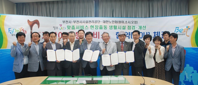 »çÁø ¿ÞÂʺÎÅÍ Çã¸ð ºÎõ½Ã º¹Áö±¹Àå, Â÷¿µ½Ä ´ëÇѳëÀÎȸ ¼Ò»ç±¸ÁöȸÀå, ÀÓ¸íÈ£ ºÎõ½Ã ½Ã¼³°ü¸®°ø´Ü ÀÌ»çÀå, °í½Â¾ð ´ëÇѳëÀÎȸ ¿ø¹Ì±¸ÁöȸÀå, ¼º´Ãá ´ëÇѳëÀÎȸ ¿ÀÁ¤±¸ ÁöȸÀå µîÀÌ Áö³ 8ÀÏ ºÎõÁ¾ÇտÀå ³» °ø´Ü ȸÀǽǿ¡¼ ¡®ÁöÆÎÀÌ Ã⵿ ¼ºñ½º¡¯ ¾÷¹«Çù¾à(MOU)À» ü°áÇÏ°í ±â³äÃÔ¿µÀ» Çϰí ÀÖ´Ù.