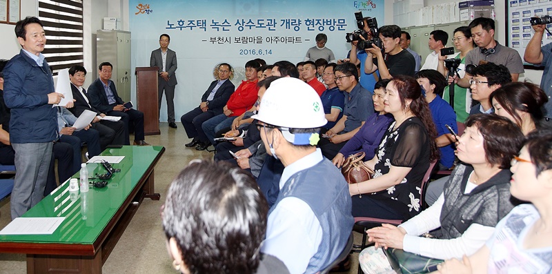 ³²°æÇÊ °æ±âµµÁö»ç°¡ 14ÀÏ ¿ÀÈÄ ³ëÈÄÁÖÅà ¼öµ¾¹° ³ì¹° ÇØ¼Ò¸¦ À§ÇØ ºÎõ½Ã º¸¶÷¸¶À» ¾ÆÁÖ¾ÆÆÄÆ®¸¦ ¹æ¹®ÇØ ÇöÀåÀ» µÑ·¯º¸°í Áֹεé°ú °£´ãȸ¸¦ Çϰí ÀÖ´Ù. 2016.6.14