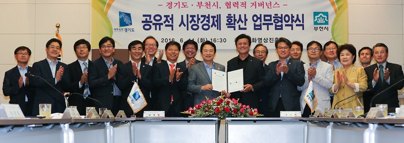 ³²°æÇÊ °æ±âµµÁö»ç(¿ÞÂÊ)¿Í ±è¸¸¼ö ºÎõ½ÃÀå(¿À¸¥ÂÊ)ÀÌ 14ÀÏ ¿ÀÈÄ ºÎõ½Ã »ó3µ¿ ¼ÒÀç Çѱ¹¸¸È¿µ»óÁøÈï¿ø 5Ãþ ¼¼¹Ì³ª½Ç¿¡¼ ¡®°æ±âµµ-ºÎõ½Ã °øÀ¯Àû ½ÃÀå°æÁ¦ È®»ê Çù¾à¡¯À» ü°áÇÏ°í ±â³äÃÔ¿µÀ» Çϰí ÀÖ´Ù. 2016.6.14 »çÁø= °æ±âµµÃ» Á¦°ø
