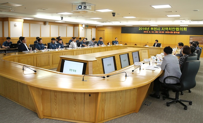 ºÎõ½Ã´Â 16ÀÏ ¿ÀÀü 10½Ã30ºÐ ½Ãû âÀǽǿ¡¼­ 9°³ ±â°ü ´ëÇ¥ ¹× °ü°èÀÚ°¡ Âü¼®ÇÑ °¡¿îµ¥¡®2016³â ºÎõ½Ã Áö¿ªÄ¡¾ÈÇùÀÇȸ¡¯¸¦ °³ÃÖÇß´Ù. 2016.6.16 »çÁø= ºÎõ½Ãû Á¦°ø