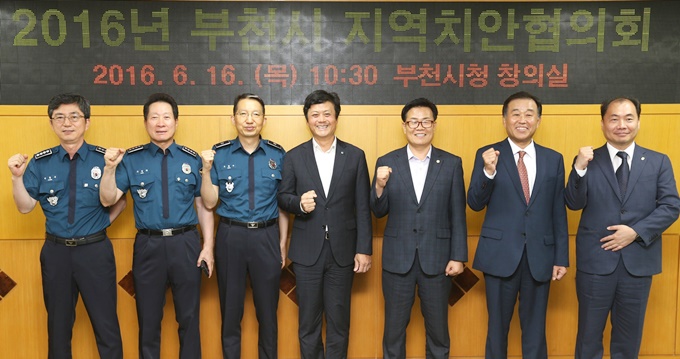 ºÎõ½Ã´Â 16ÀÏ ¿ÀÀü 10½Ã30ºÐ ½Ãû âÀǽǿ¡¼­ ¿ø¹Ì¤ý¼Ò»ç¤ý¿ÀÁ¤°æÂû¼­¸¦ ºñ·ÔÇØ 9°³ ±â°ü ´ëÇ¥ ¹× °ü°èÀÚ 20¿©¸íÀÌ Âü¼®ÇÑ °¡¿îµ¥ ½Ã¹ÎÀÌ ¾È½ÉÇÏ´Â ¾ÈÀüµµ½Ã ºÎõÀ» À§ÇÑ ¡®2016³â ºÎõ½Ã Áö¿ªÄ¡¾ÈÇùÀÇȸ¡¯¸¦ °³ÃÖÇß´Ù. »çÁø ¿ÞÂʺÎÅÍ ¹Úµ¿¼ö ¿ÀÁ¤°æÂû¼­Àå, ±¸Àåȸ ¼Ò»ç°æÂû¼­Àå, ¿ìÁ¾¼ö ¿ø¹Ì°æÂû¼­Àå, ±è¸¸¼ö ºÎõ½ÃÀå, ±è¹®È£ ºÎõ½ÃÀÇȸ ÀÇÀå, ±èÁ¾¿À ºÎõ¼¼¹«¼­Àå, ÇÑÁ¤¼® ºÎõ´ëÇб³ ÃÑÀå. 2016.6.16 »çÁø= ºÎõ¿ø¹Ì°æÂû¼­ Á¦°ø