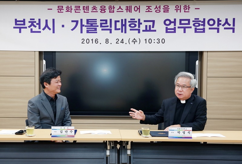 ±è¸¸¼ö ºÎõ½ÃÀå°ú ¹Ú¿µ½Ä °¡Å縯´ëÇб³ ÃÑÀå(¿ÞÂʺÎÅÍ)ÀÌ 24ÀÏ ¿ÀÀü ½Ãû ¸¸³²½Ç¿¡¼­ »óµ¿¿µ»ó¹®È­»ê¾÷´ÜÁö¿¡ µé¾î¼­´Â À¥Å÷À¶ÇÕâÁ¶¼¾ÅÍ ³» ¡®¹®È­ÄÜÅÙÃ÷À¶ÇÕ½ºÄù¾î¡¯ Á¶¼ºÀ» À§ÇÑ ¾÷¹«Çù¾àÀ» ü°áÇÏ°í ±â³äÃÔ¿µÀ» Çϰí ÀÖ´Ù. 2016.8.24