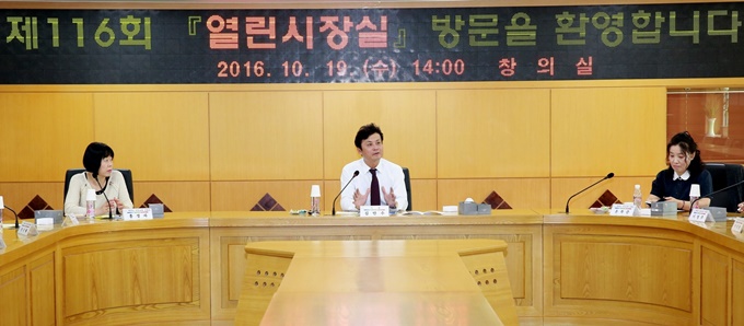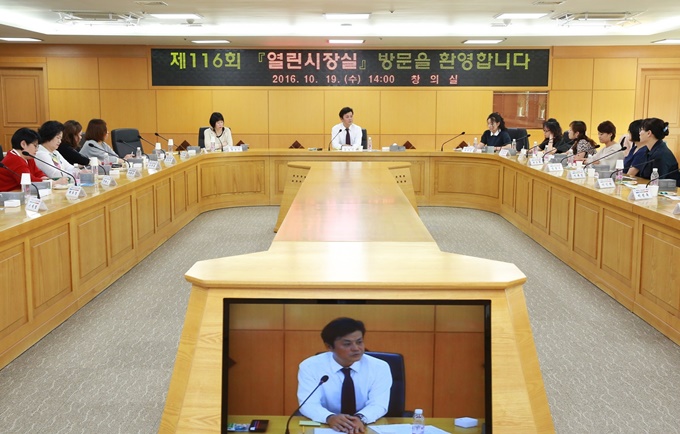 ÇÑÆí, Áö³­ 2013³â 6¿ùºÎÅÍ ½ÃÀÛÇÑ ¡®¿­¸° ½ÃÀå½Ç¡¯Àº ½ÃÀå°ú ½Ã¹ÎÀÌ Á÷Á¢ ¸¸³ª ´ëÈ­ÇÏ°í ½ÃÀå Áý¹«½ÇÀ» Æ÷ÇÔÇÑ Ã»»ç ÁÖ¿ä½Ã¼³À» µÑ·¯º¸´Â ¹æ½ÄÀ¸·Î, ¸ÅÁÖ ¼ö¿äÀÏ ¿ÀÈÄ 2½ÃºÎÅÍ 5½Ã±îÁö ÁøÇàµÇ¸ç, Áö±Ý±îÁö 116ȸ¿¡ °ÉÃÄ ¿î¿µµÅ ½Ã¹Î 3õ¸íÀÌ Âü¿©Çß´Ù.