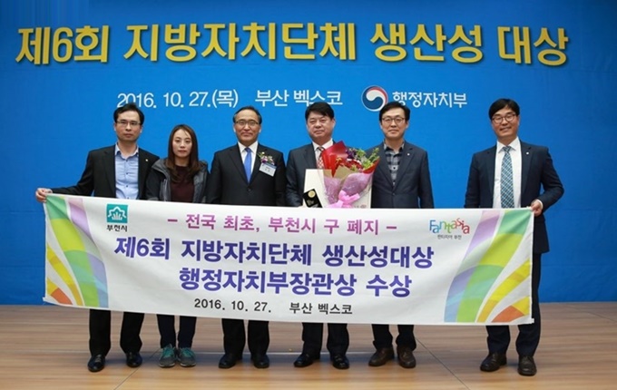 ºÎõ½Ã°¡ ÇàÁ¤ÀÚÄ¡ºÎ¿Í Çѱ¹»ý»ê¼ºº»ºÎ°¡ °øµ¿ ÁÖ°üÇÑ ¡®Á¦6ȸ ´ëÇѹα¹ Áö¹æÀÚÄ¡´Üü »ý»ê¼º´ë»ó¡¯¿¡¼ ÇàÁ¤°ü¸®ºÐ¾ß¿¡¼ ÃÖ¿ì¼ö±â°üÀ¸·Î ¼±Á¤µÅ 27ÀÏ ºÎ»ê º¤½ºÄÚ¿¡¼ ¿¸° ½Ã»ó½Ä¿¡¼ ÇàÁ¤ÀÚÄ¡ºÎ Àå°ü»óÀ» ¹Þ¾Ò´Ù.
