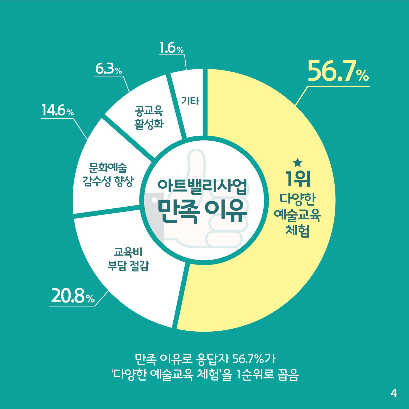 ºÎõ¾ÆÆ®¹ë¸®»ç¾÷¿¡ ¸¸Á·ÇÏ´Â ÀÌÀ¯·Î´Â ÀÀ´äÀÚ 56.7%°¡ ¡®´Ù¾çÇÑ ¿¹¼ú±³À° üÇ衯À» 1¼øÀ§·Î ²Å¾Ò°í, ±³À°ºñ ºÎ´ã Àý°¨(20.8%), ¹®È¿¹¼ú °¨¼ö¼º Çâ»ó(14.6%), °ø±³À° Ȱ¼ºÈ(6.3%), ±âŸ(1.6.%) ¼øÀ¸·Î ²Å¾Ò´Ù.