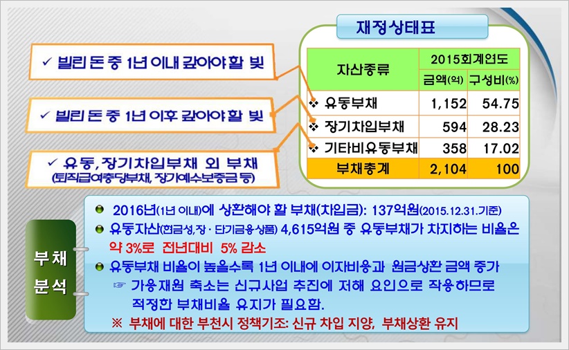 ½Ã°¡ °Ô½ÃÇÑ 2015³â ȸ°è¿¬µµ Á¦¹«Á¦Ç¥¿¡´Â ºÎõ½ÃÀÇ ÃÑ ÀÚ»ê±Ô¸ð, ÇâÈÄ ºÎ´ãÇØ¾ß ÇÒ ºÎä(ºú), ¹ú¾îµéÀÎ ¼öÀÔ¾×°ú ¼öÀÔ ¿øÃµ, ÀÚ±Ý(¼¼±Ý)À» ÁýÇà(»ç¿ë)ÇÑ ¸ñÀû, »ç¾÷º°·Î ÅõÀÔÇÑ ÃÑ¿ø°¡¤ý»ç¾÷¼öÀͤý¼ø¿ø°¡ µîÀ» È®ÀÎÇÒ ¼ö ÀÖ´Ù.