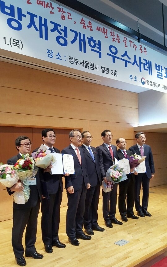 È«À±½Ä ÇàÁ¤ÀÚÄ¡ºÎ Àå°ü(¿ÞÂÊ¿¡¼­ ³× ¹øÂ°)ÀÌ Áö³­ 1ÀÏ Á¤ºÎ¼­¿ïû»ç º°°ü 3Ãþ ±¹Á¦È¸ÀÇÀå¿¡¼­ ¿­¸° ¡®2016³âµµ Áö¹æÀçÁ¤°³Çõ ¿ì¼ö»ç·Ê ¹ßÇ¥´ëȸ¡¯¿¡¼­ ¼ö»ó ÁöÀÚü °øÁ÷ÀÚµé°ú ±â³äÃÔ¿µÀ» Çϰí ÀÖ´Ù. ¸Ç ¿ÞÂÊÀº ±¹¹«ÃѸ® ±â°üǥâ°ú 3¾ï¿øÀÇ Á¦Á¤Àμ¾Æ¼ºê¸¦ ¹ÞÀº Çѱâ¹Î ºÎõ½Ã ´©¼ö¼ö¸®ÆÀÀå.