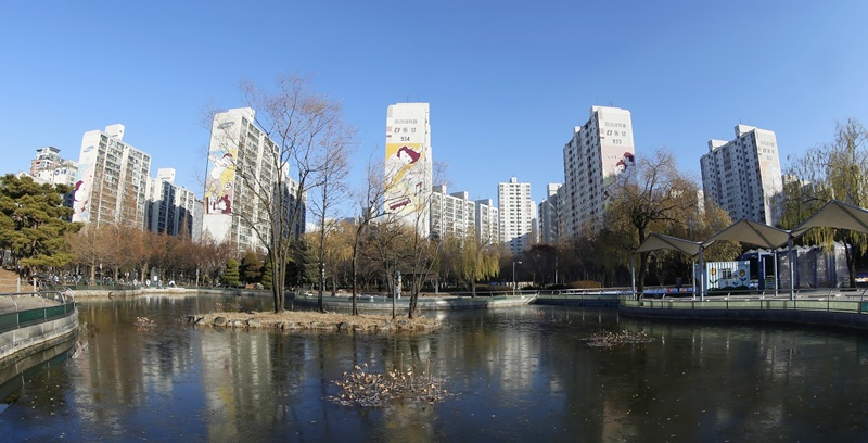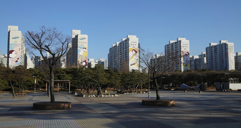 ºÎõ Áß¾Ó°ø¿ø¿¡¼­ ¹Ù¶óº» ¹Ì¸®³»¸¶À» µ¿¼º¾ÆÆÄÆ® ¿Üº®¿¡ ¡®¸¸È­ º®È­¡¯°¡ µîÀåÇØ ´«±æÀ» ²ø°Ô Çϰí ÀÖ´Ù.