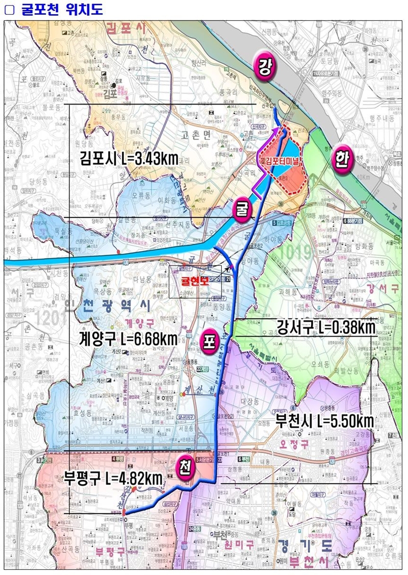 ±¼Æ÷õÀº ÀÎõ½Ã ºÎÆò±¸ ûÀüµ¿¿¡¼ ±èÆ÷½Ã °íÃ̵¿ ÇѰ ÇÕ·ùÁ¡±îÁö ÃÑ¿¬Àå 15.31km(ÇÏõ Æø 23~100m, ¼ö½É 1.0~6,25m) ±¸°£¿¡ 3°³ ±¤¿ª½Ã¿Í 5°³ ±âÃÊÀÚÄ¡´Üü¸¦ °ü·ùÇÏ´Â Áö¹æÇÏõÀÌ´Ù.