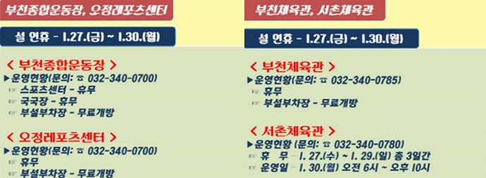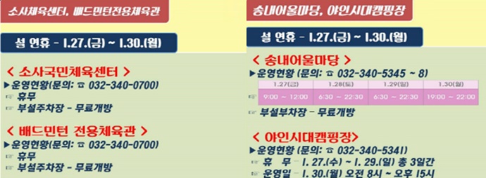 ºÎõ½Ã½Ã¼³°ü¸®°ø´Ü(ÀÌ»çÀå ÀÓ¸íÈ£)Àº 27~30ÀϱîÁö ¼³ ¿¬ÈÞ ±â°£¿¡ °ø¿µÁÖÂ÷ÀåÀ» ¹«·á °³¹æÇÏ´Â µî ½Ã¹ÎÀÌ ºÒÆí¾øÀÌ Æí¾ÈÇÑ ¸íÀýÀ» º¸³¾ ¼ö ÀÖµµ·Ï ¡®¼³ ¿¬ÈÞ ½Ã¼³ Á¾Çտ´ëÃ¥¡¯À» ÃßÁøÇÑ´Ù°í 26ÀÏ ¹àÇû´Ù.